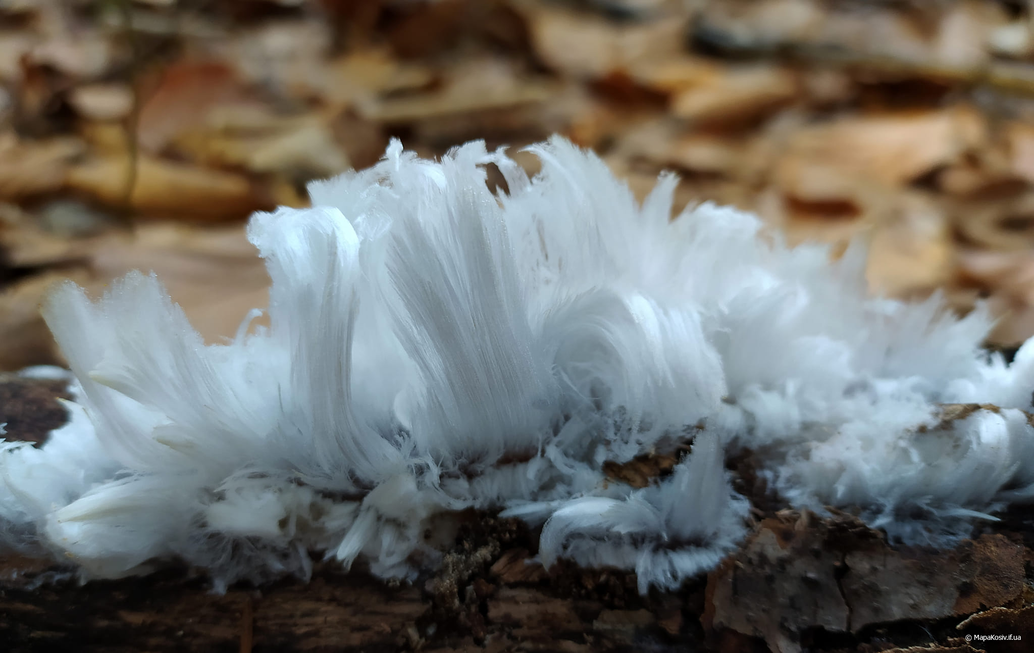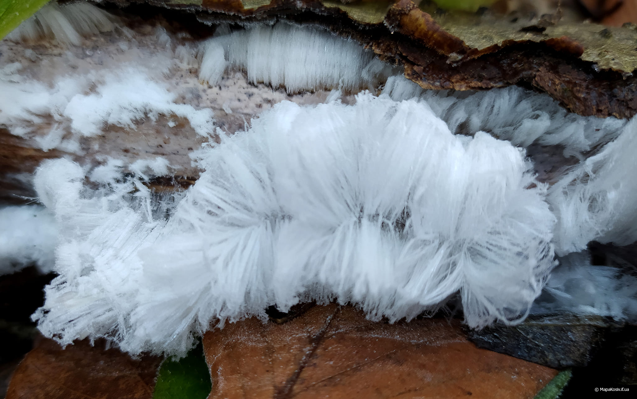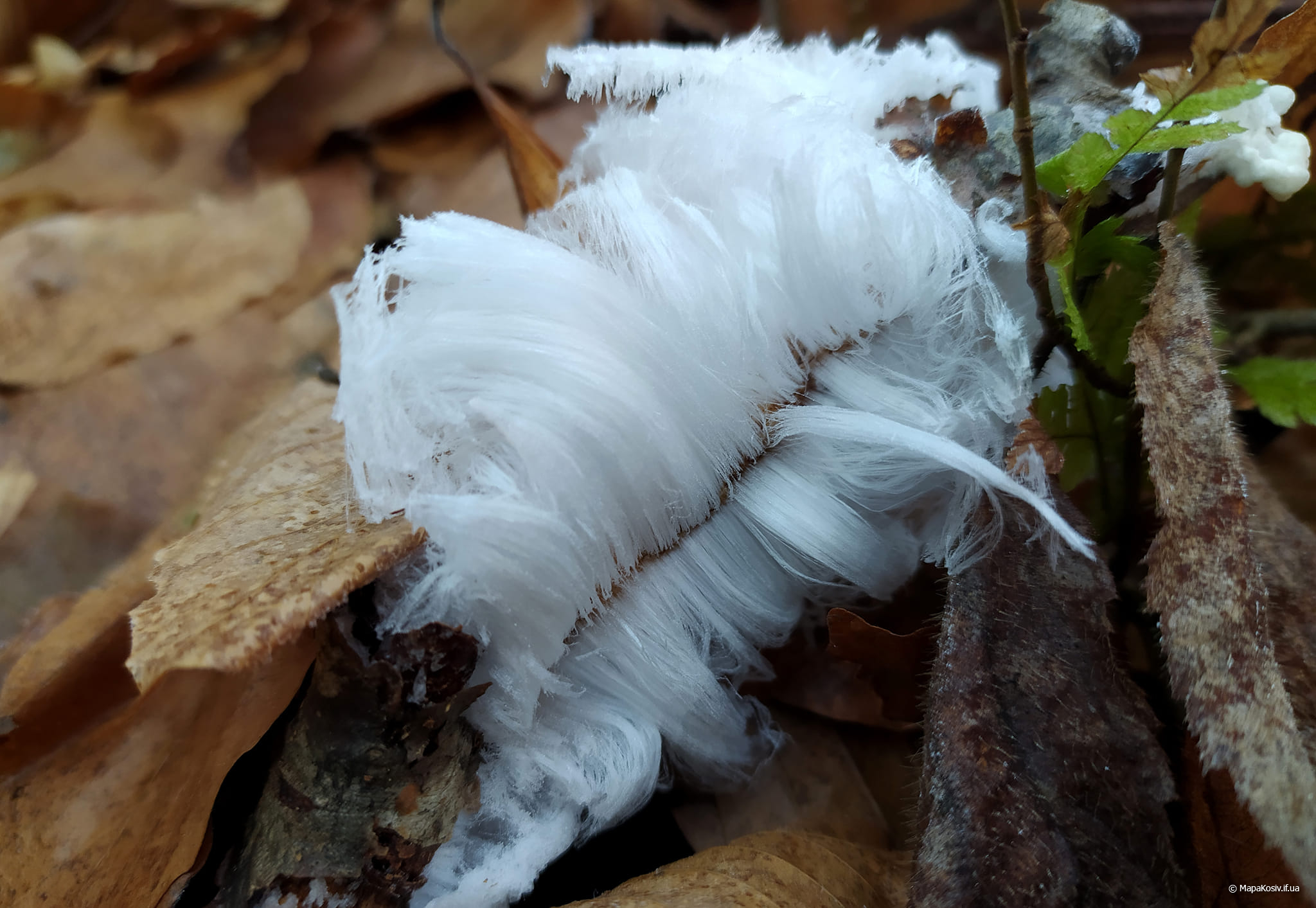 “Виявлені зразки рідкісного явища, званого “крижаним волоссям”, “льодяною бородою” або “волохатим льодом”, – зауважив він. Світлини зробленні у грудні 2022.