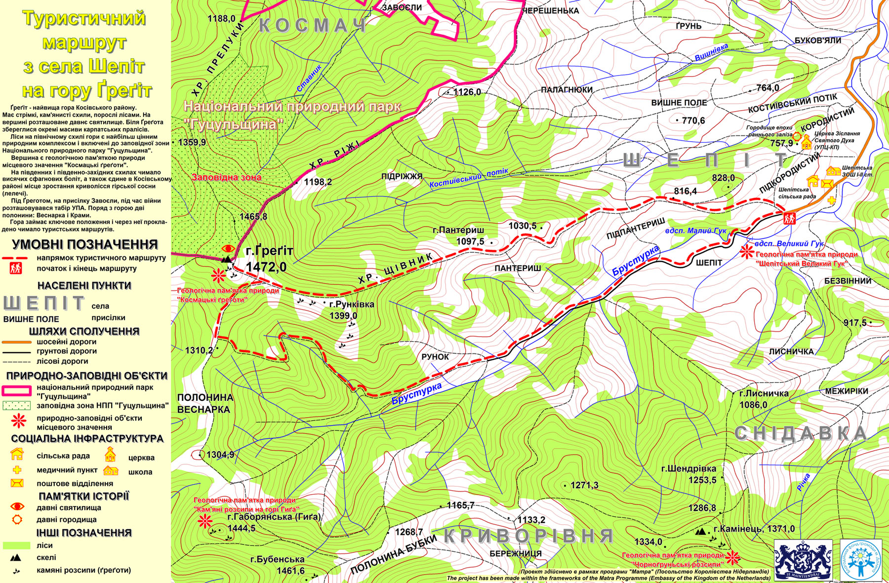 Туристичний маршрут з села Шепіт на гору Ґрегіт (карта) (1911 downloads )Проект розробки туристичних маршрутів на Косівщині здійснено в рамках програми «Матра» (Посольство Королівства Нідерландів).