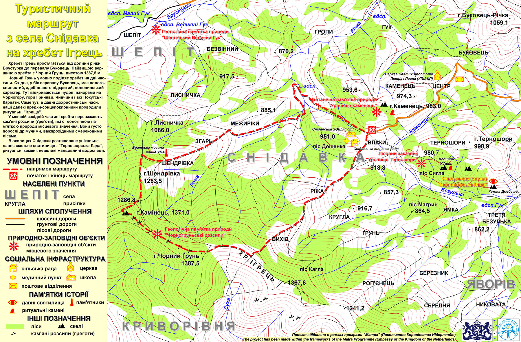 Туристичний маршрут з села Снідавка на хребет Ігрець (карта) (1856 downloads )Проект розробки туристичних маршрутів на Косівщині здійснено в рамках програми «Матра» (Посольство Королівства Нідерландів).