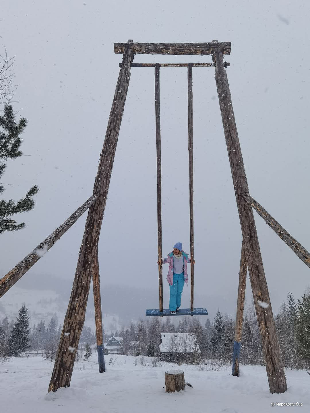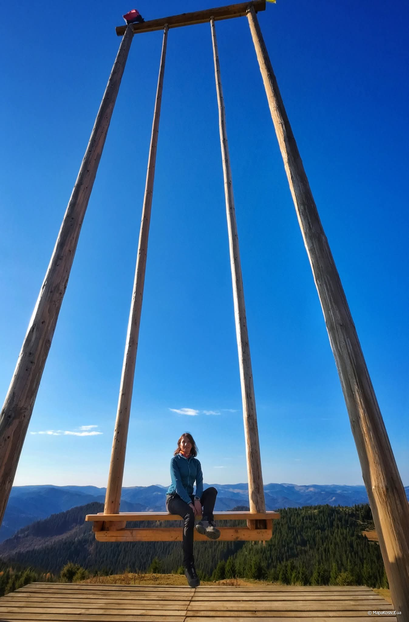 Розташована у Буковелі й досить популярна серед користувачів Instagram. Над гойдалкою працювали п’ятеро людей. Відомо, що деревину взяли місцеву: смереку міцну. Спершу колоди обтесали на землі, а саму конструкцію сколочували вже нагорі. Гойдалку виміряли й представники книги рекордів України. Виявилося, що висота конструкції сягає 8 метрів та 88 сантиметрів – це найвища гойдалка в Україні.