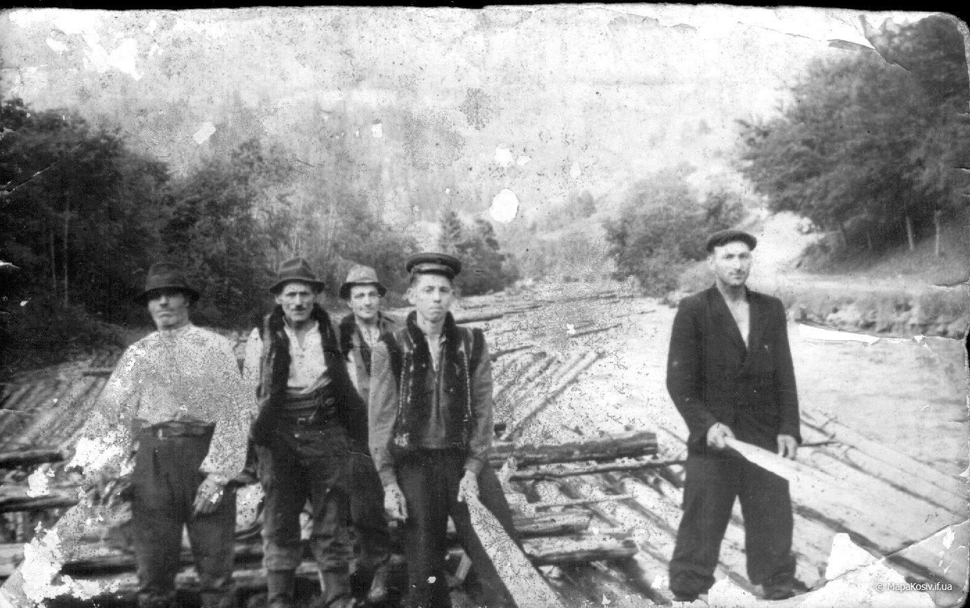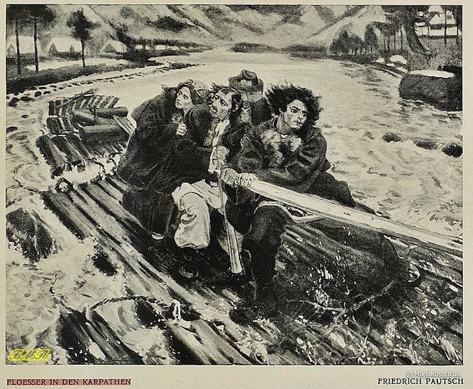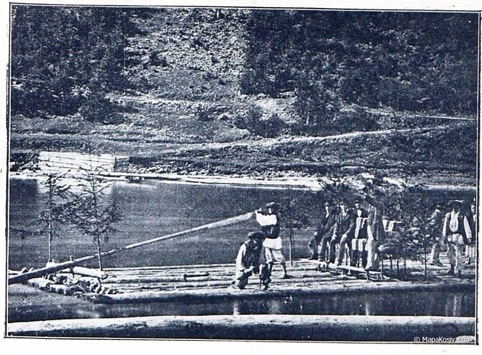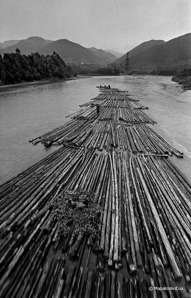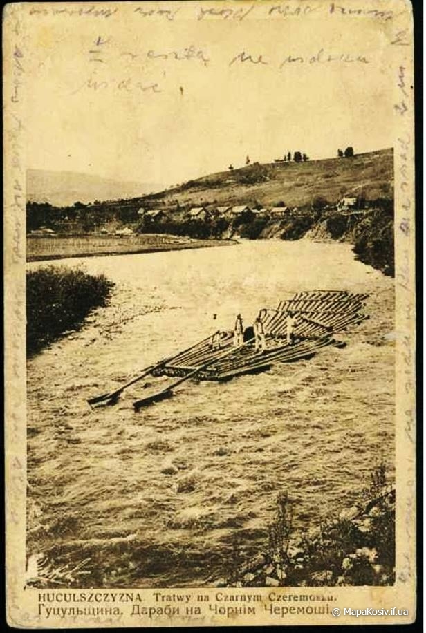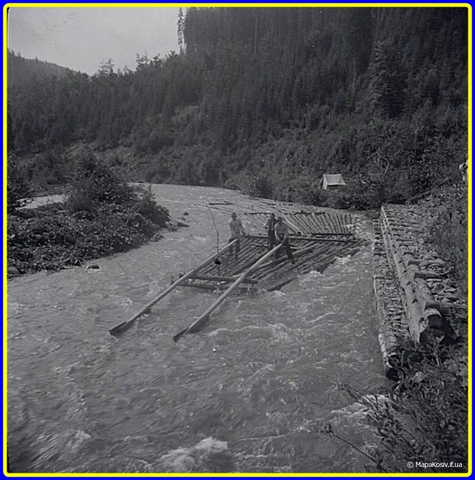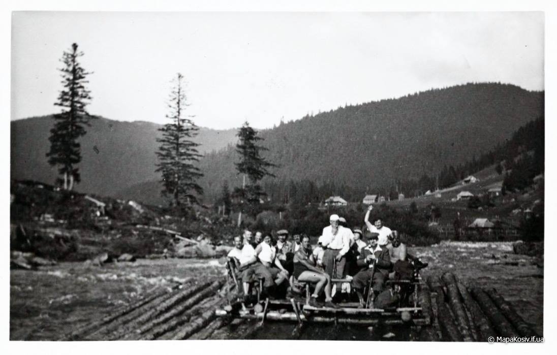 Отже це дараба „звідтіля”, з Буковини! Цікаво, чи „звідсіля” мають теж хоруговку? Теж таку невинну, дитячу, лише червоно-білу? Годі! Не можна тут мріяти. І не треба! Бо зявиться якась хоруговка й пригадає нам дійсність. Що гордий леґінь зійшов із вершка гори і провадить тепер чужу дарабу. Що замість „пана мандатора” їздить оцим шляхом його нащадок, але вже ніхто на нього не чатує…” Дараби,керманичі-плотогони на Черемоші .1930 р.р.
