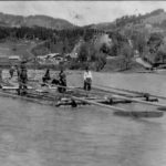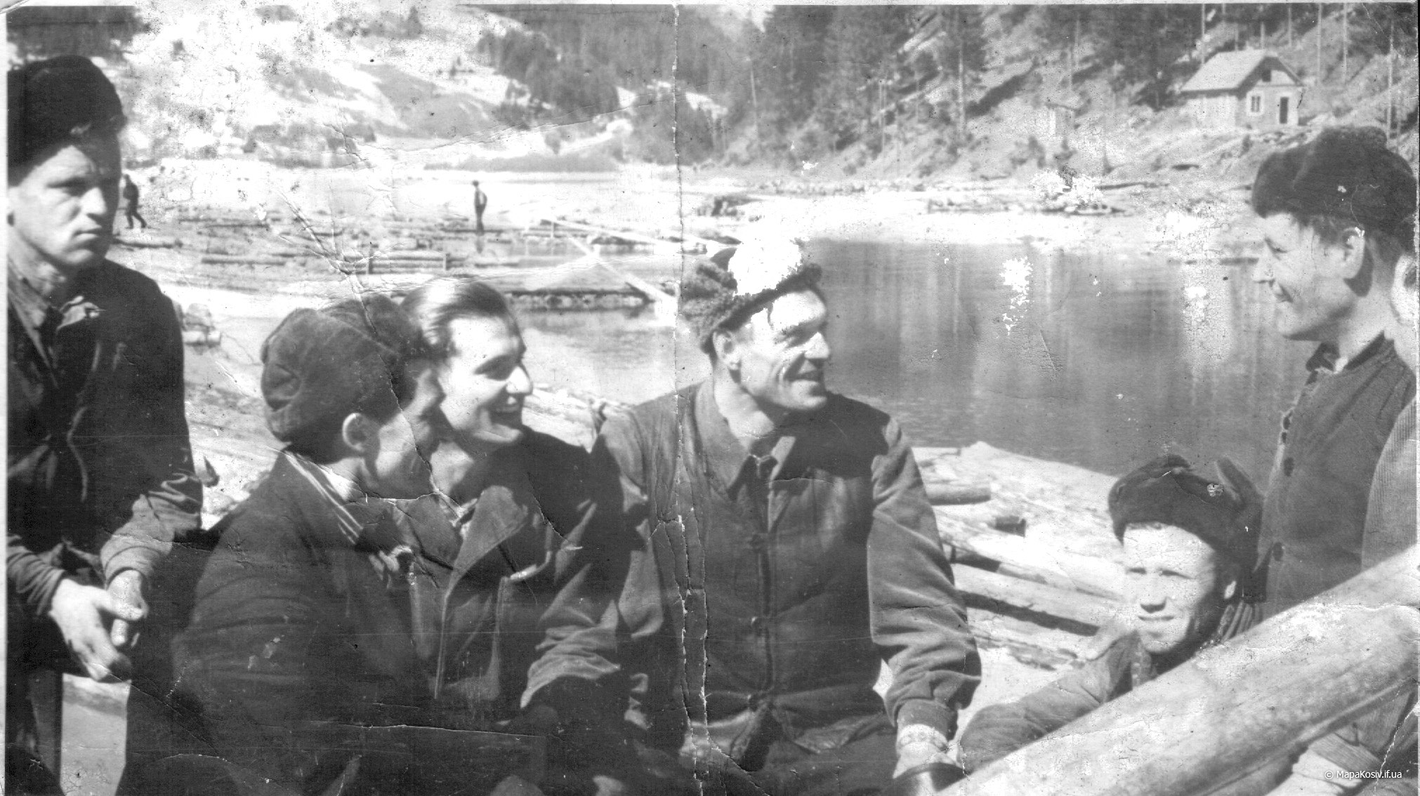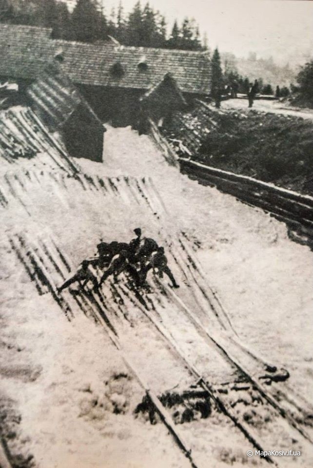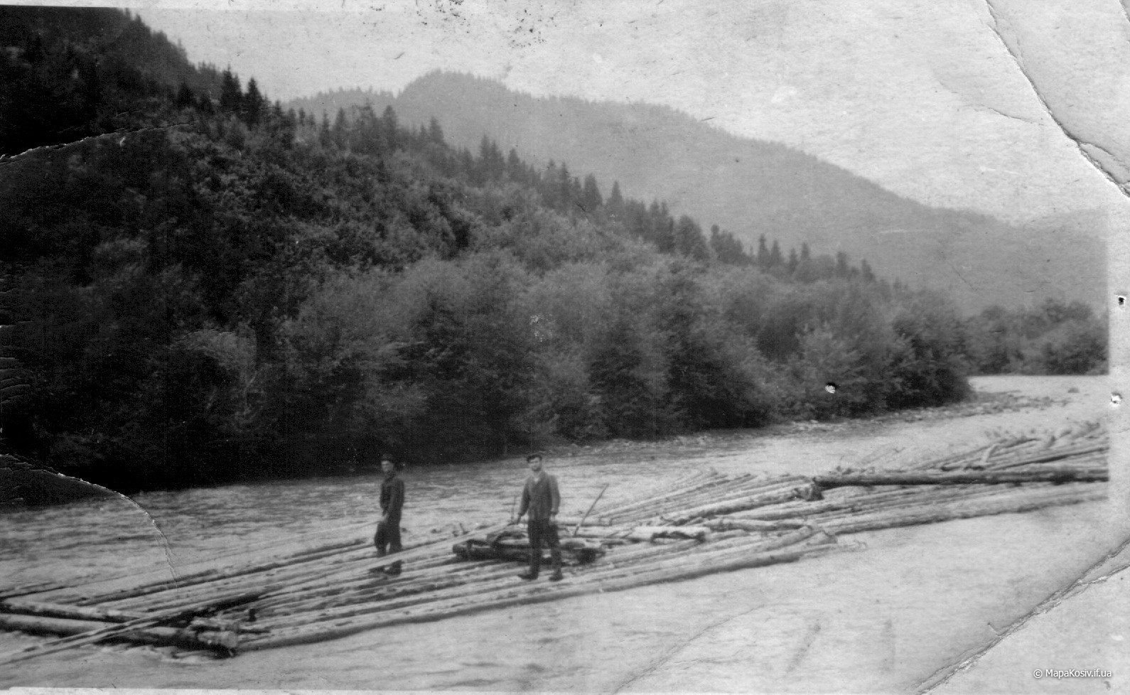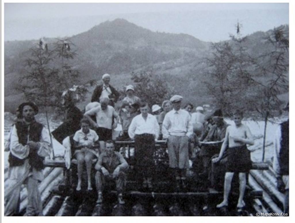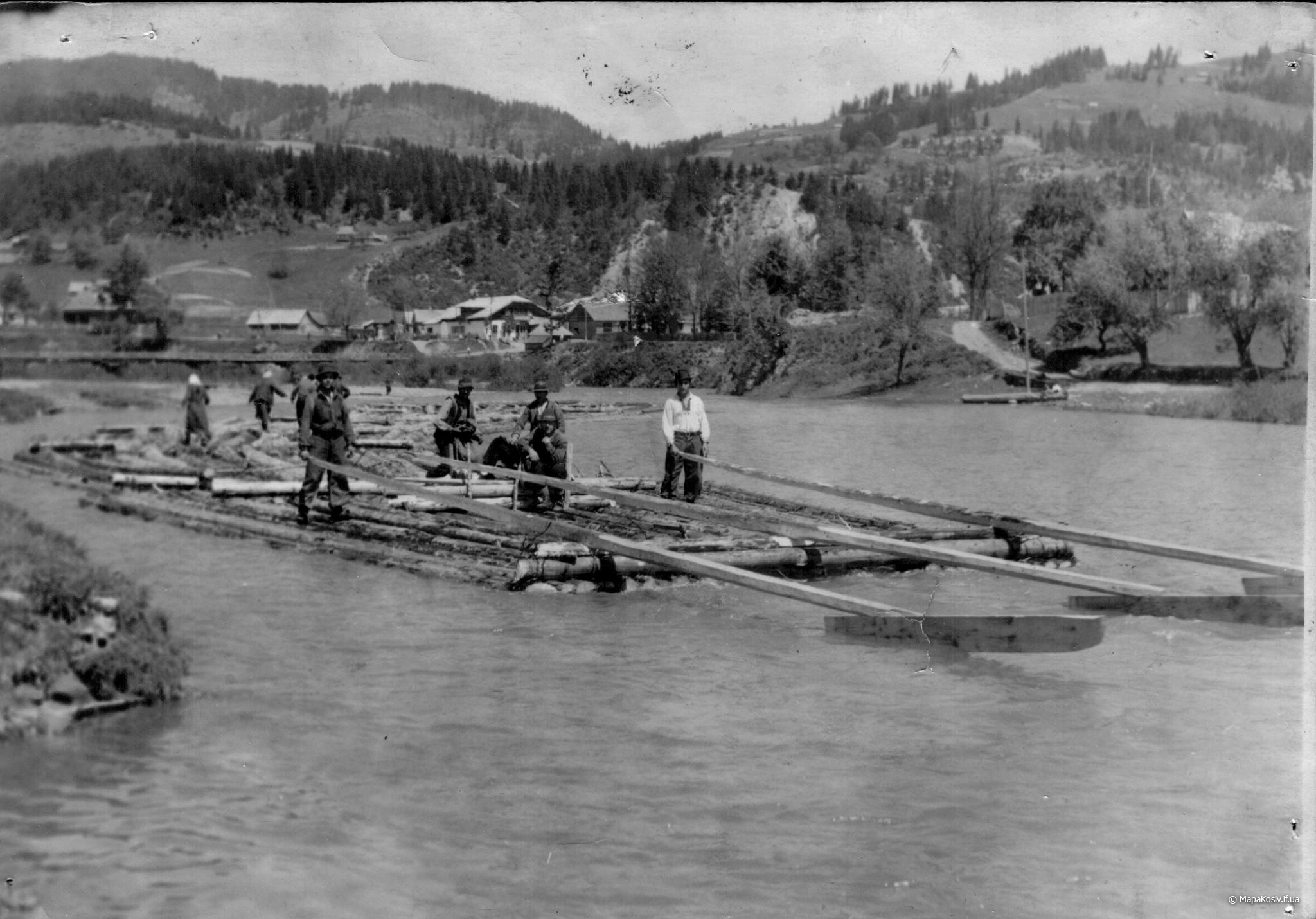 Отже це дараба „звідтіля”, з Буковини! Цікаво, чи „звідсіля” мають теж хоруговку? Теж таку невинну, дитячу, лише червоно-білу? Годі! Не можна тут мріяти. І не треба! Бо зявиться якась хоруговка й пригадає нам дійсність. Що гордий леґінь зійшов із вершка гори і провадить тепер чужу дарабу. Що замість „пана мандатора” їздить оцим шляхом його нащадок, але вже ніхто на нього не чатує…” Дараби,керманичі-плотогони на Черемоші .1930 р.р.