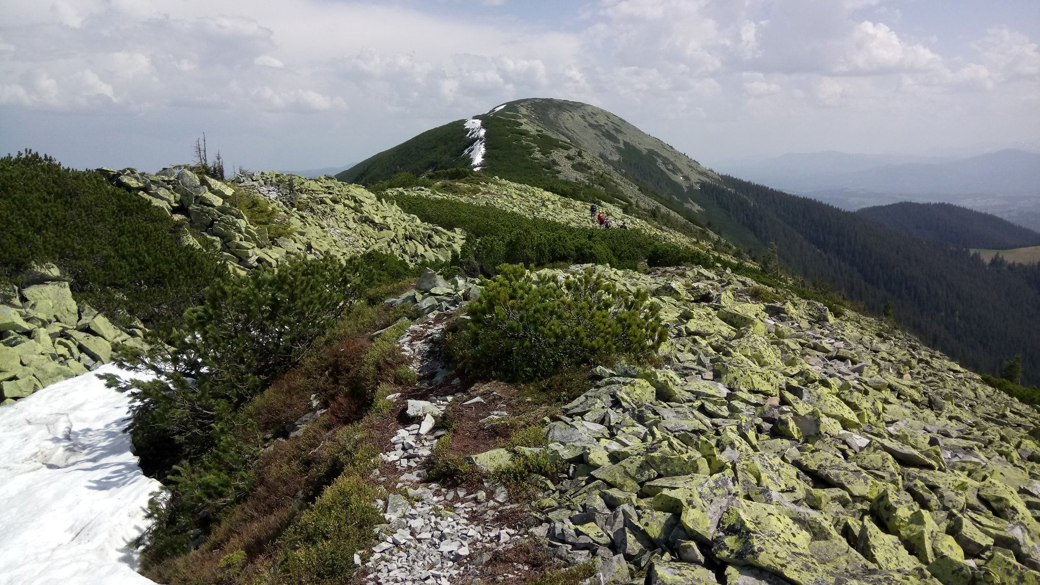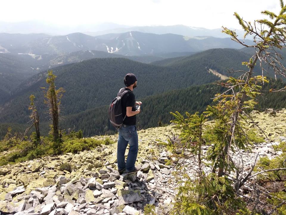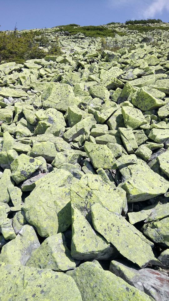 За певний час, вибігаємо до полонини Томнатик. З неї відкривається чудовий і унікальний краєвид на хребет Синяк. Тут гріх не зробити фотосесію). Згодом починається затяжний серпантин на Синяк. Стежка час від часу губиться серез греготів, але це ж типово для Горган, проте слідкуючи уважно за маркером, успішно виходимо на вершину. Робимо привал та обід, фотографуємось.