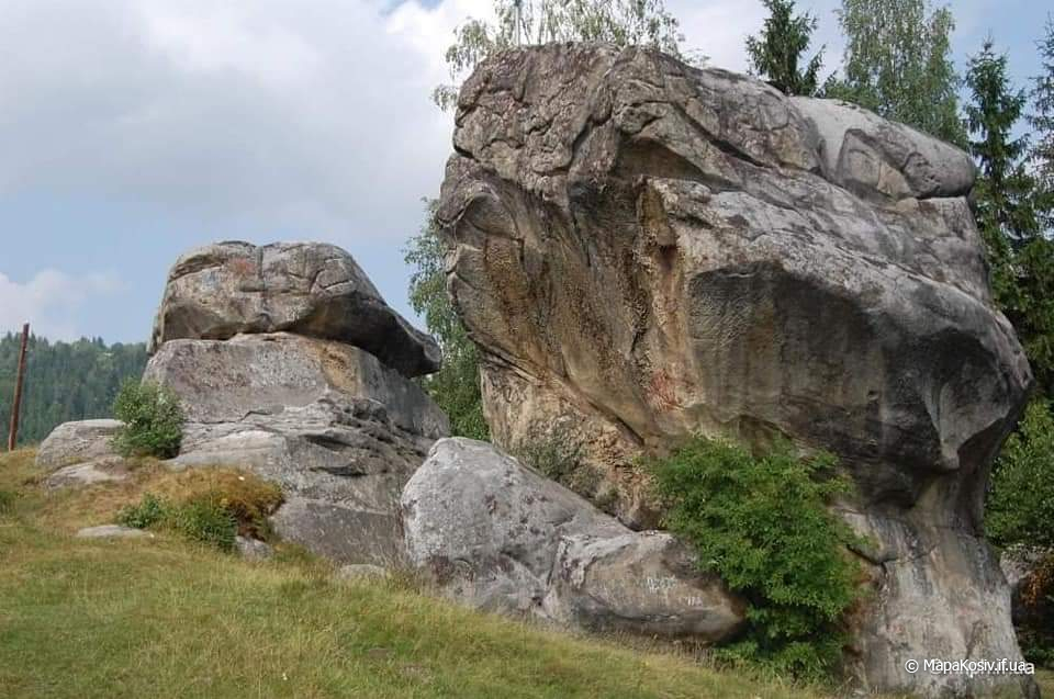 І ще невідомо, хто має більше рації! А ось із чим погодяться всі – так це з тим, що місце, де розташований мегаліт, дивовижно гарне. Історія Хоча святилище, яке має назву «Камінь Довбуша в Завоєлах» виявили достатньо давно, дослідження його перебувають поки що на початковому етапі. Утім, уже й зараз дехто з фахівців стверджує, що це стародавнє святилище в Космачі є унікальною пам’яткою вітчизняної історії й культури. На камінні легко помітити гігантські за розмірами зооморфні зображення. Найбільший восьмиметровий камінь має вигляд змія (дракона), голова якого піднята високо вгору, до сонця.