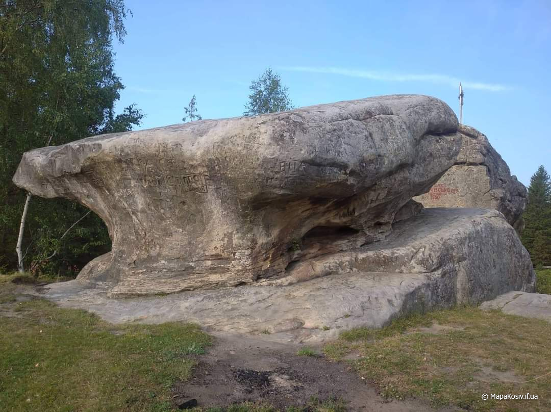 Уважно придивившись, можна помітити ще одного персонажа безпосередньо перед пащею дракона: висічене з каменю теля, яке в міфології асоціюється із жертвоприношенням. Характер міфологічних образів, які використані тут, свідчить про те, що населення краю вірило в божество, котре уособлювало могутні сили природи, кругообіг часу, оновлення землі. Петрогліфи На більшості каменів легко побачити вирізьблені петрогліфи (висічені малюнки): хрести, ромби, трикутники, продовгуваті округлі прорізи. Також є зооморфні зображення змія, теляти, собаки, зорієнтовані на всі чотири сторони світу. Камінь Довбуша у цифрах і фактах Кількість кам’яних брил – близько 20. Порода – ямненський пісковик. Площа, яку займає пам’ятка, – понад 2 тисячі квадратних метрів.